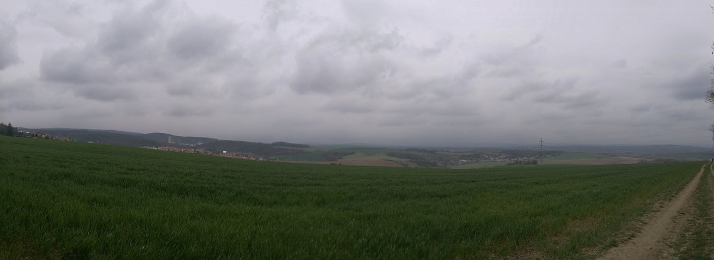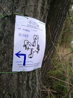 Vyšly jsme kousek za Šlapanice a na nebi jsme viděly jen šedivou deku, která nás provázela celou cestu. S tím, že nemáme kam spěchat jsme nechávaly ostatní týmy, ať nás předbíhají, protože Černá Čůza má raději psy před sebou než za zadkem. Od začátku byla trasa velmi dobře značená a na směrovkách byly i velmi pěkné popisky kam máme jít.