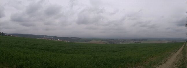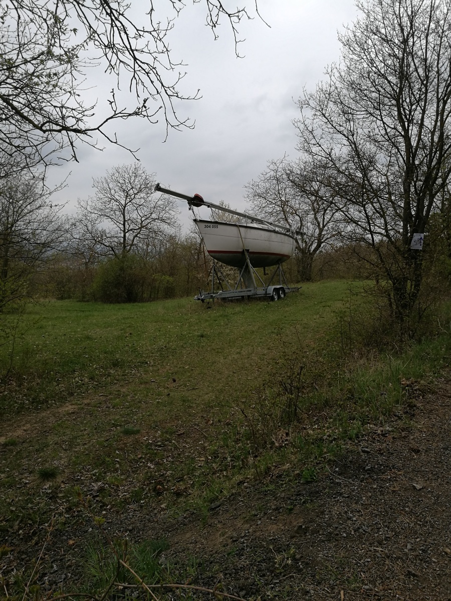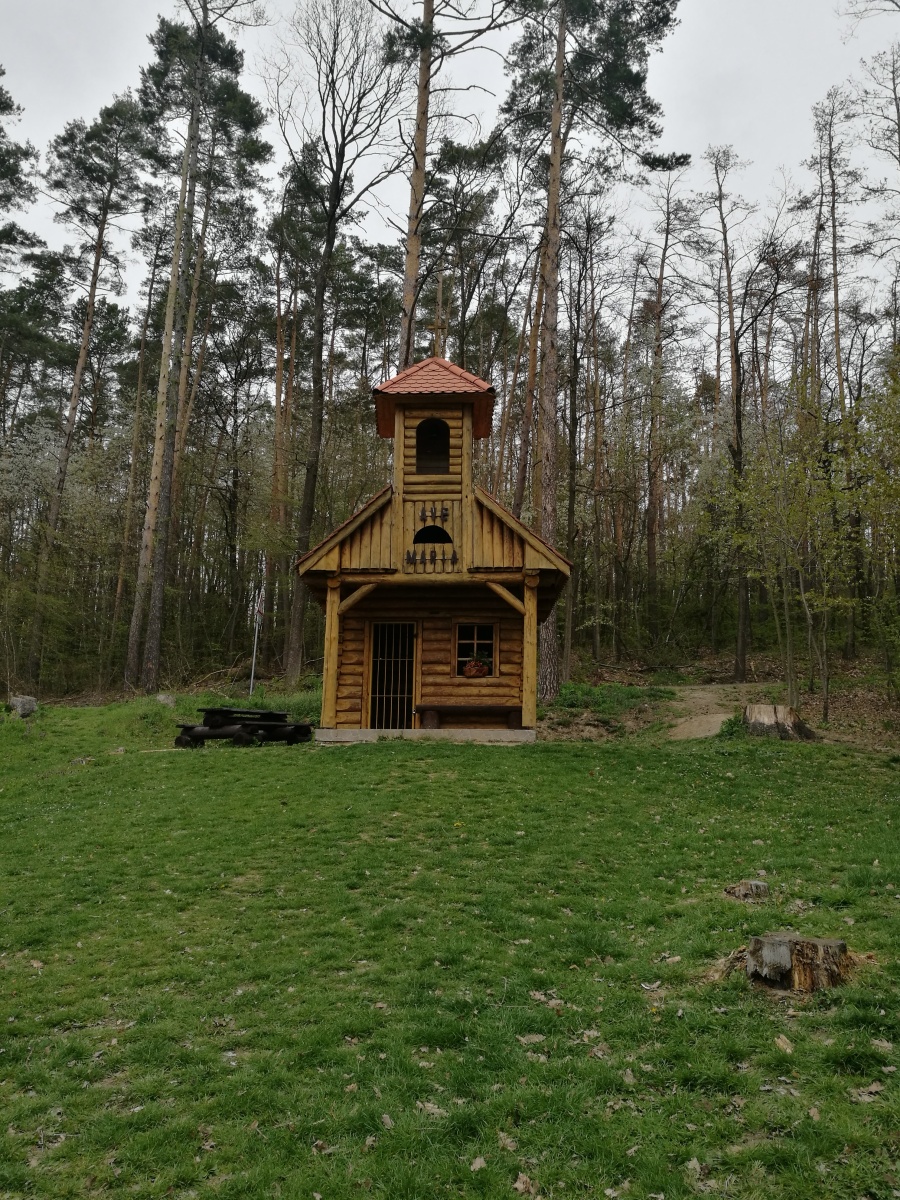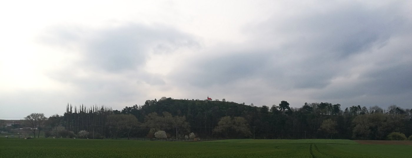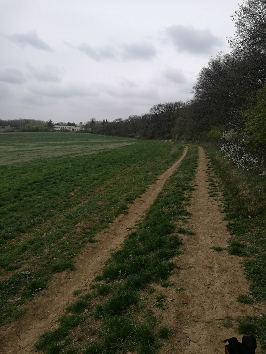 Dál na nás čekala druhá kontrola, která byla u Studánky v Napajedlích, nemohly jsme se připravit o bližší prozkoumání a čubina to vzala celkem dost podrobně. Odtud jsme pokračovaly dál a po projití další vesnice mně Černá Čůza zaskočila tím, že se nudí a rozhodla se pěkně ožužlat a proběhnout na gumicuku s klackem v hubě. Trochu mi zamotala hlavu, a tak, když jsem viděla loď na louce jsem nevěřila vlastním očím. Ale opravdu tam byla. Dál jsme narazily na nádhernou dřevěnou Kapli Mitrovských a od ní jsme se dostali na část trati, odkud by byly opravdu nádherné výhledy, bohužel nám to stále kazilo hnusně šedé nebe s oparem. Viděly jsme v dálce cementárku, kolem níž jsme prošly. I když v ošklivém světle, ale i tak jsme viděly slavné moravské vlnky na polích.